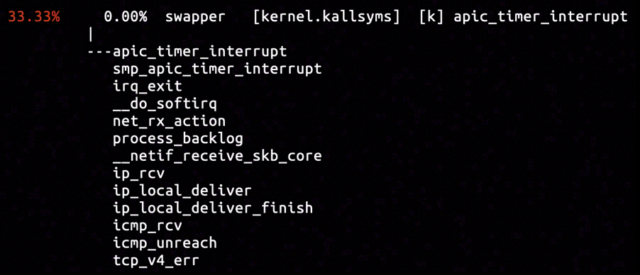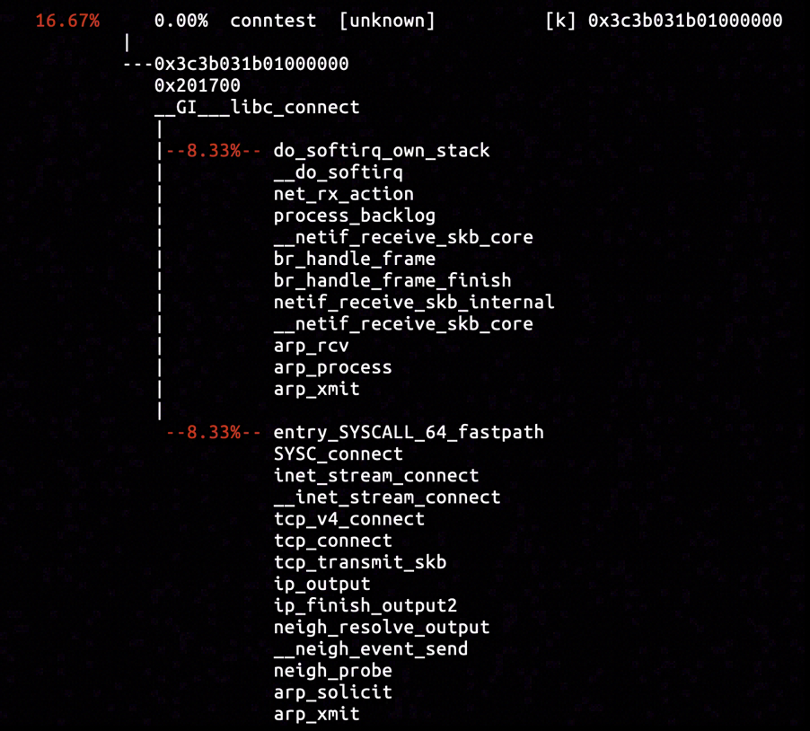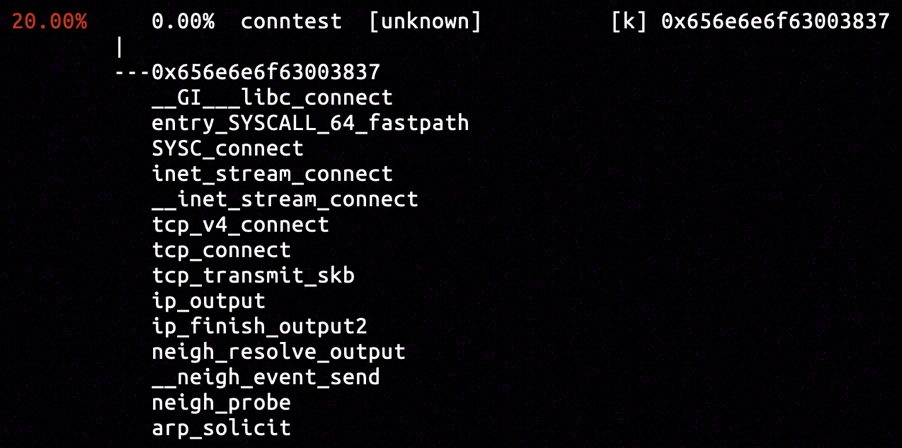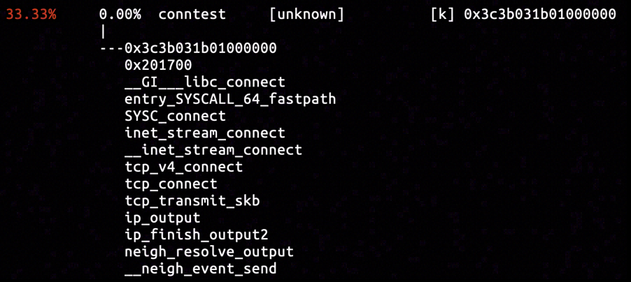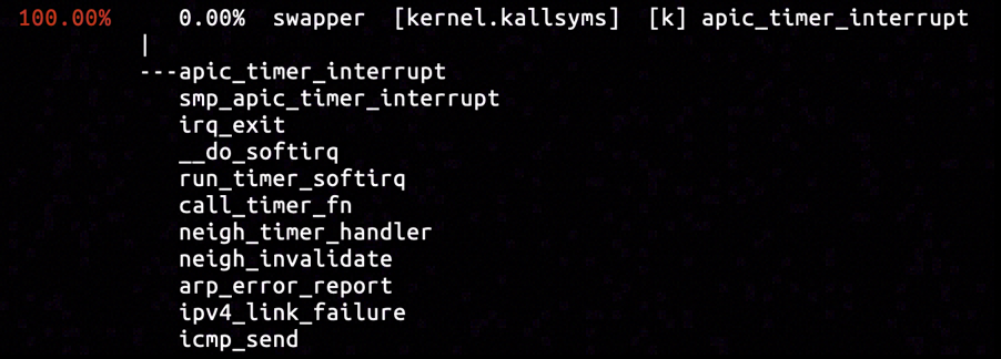 The destination IP referred to a virtual ethernet interface on the same host (rather than another machine on network), so the ICMP packet might have been generated on the current operating host. We will try out luck to capture the call stacks associated with icmp_send.
