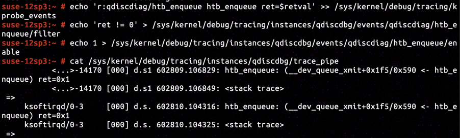 In our experiment, we've set HTB as traffic control policy, whose corresponding enqueuing function is htb_enqueue. By inserting KRetProbe to symbol htb_enqueue, and setting up filter for non-zero return value only, we've confirmed it was the htb_enqueue that dropped the skb and returned NET_XMIT_DROP.