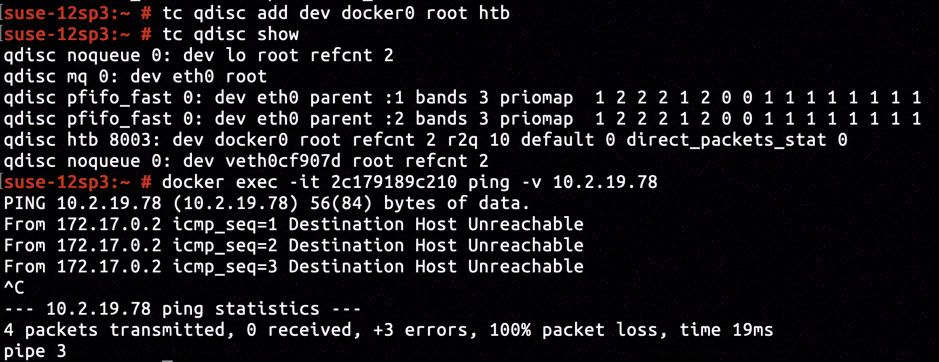 By issuing tc qdisc add dev docker0 root htb we've added a traffic control policy of Hierarchical Token Bucket (abbreviated HTB) to the Docker interface. Checking the connectivity by pinging from inside the container, using docker exec -it 2c179819c210 ping -v 10.2.19.78, we constantly received error message "Destination Host Unreachable", rendering the connectivity between container and host was broken.
