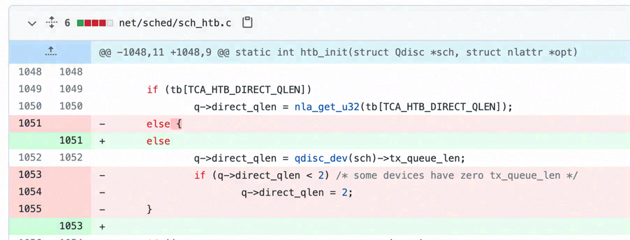 Actually by toggling on and off networking related modules in our software, I was able to quickly narrowed down that the networking problem is rooted in the HTB traffic control policy we added. And even I was totally not familiar with components in Linux networking modules, I was able to locate the zero assignment when initializing HTB quickly.