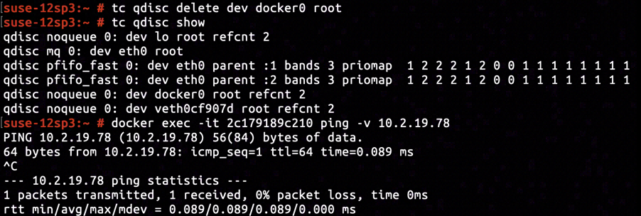 After issuing tc qdisc delete dev docker root0 to remove the previously added traffic control policy, we found the connectivity was fixed instantly.