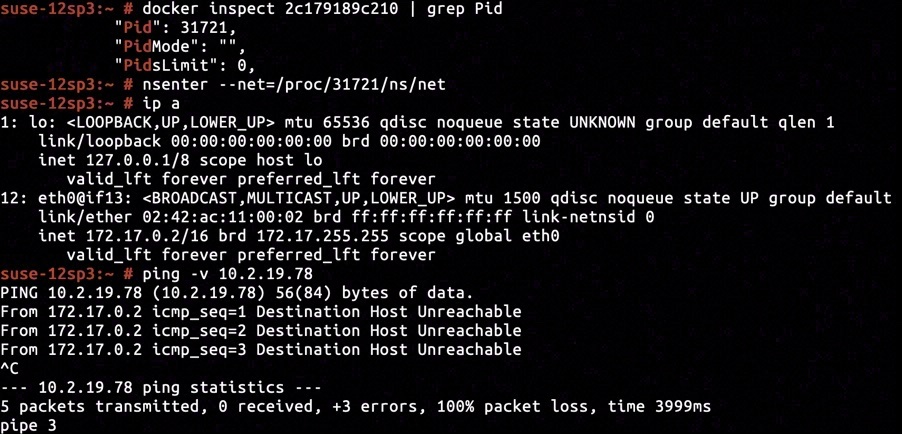 The container's network namespace comprised of a loopback interface lo and a virtual ethernet interface eth0@if13 with IP address configured to be 172.17.0.2. Pinging the host ethernet address would we be ponged with "Destination Host Unreachable", just identical to what we've seen when issuing docker exec 2c179819c210 ping -v 10.2.19.78 outside the container.