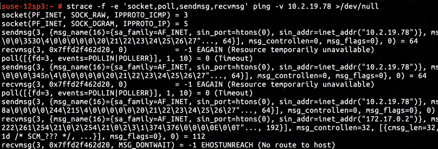 By tracing system calls during ping's execution with strace, we found out that socket created a raw socket dedicated to ICMP protocol, operating on the raw socket sendmsg initiated a ICMP ping request to destination with addess 10.2.19.78, and finally recvmsg received the error EHOSTUNREACH generated by eth0@if13.