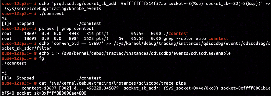 We are not alone invoking socket system call for creating socket. To effectively trace the sock object created by conntest, we will need to retrieve the PID of conntest and set it as a filter before conntest invokes socket system call.